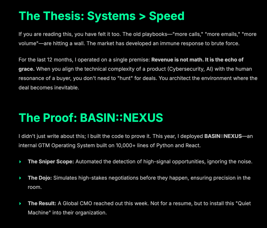• The Result: A Global CMO reached out this week. Not for a resume, but to install this “Quiet Machine” into their organization.